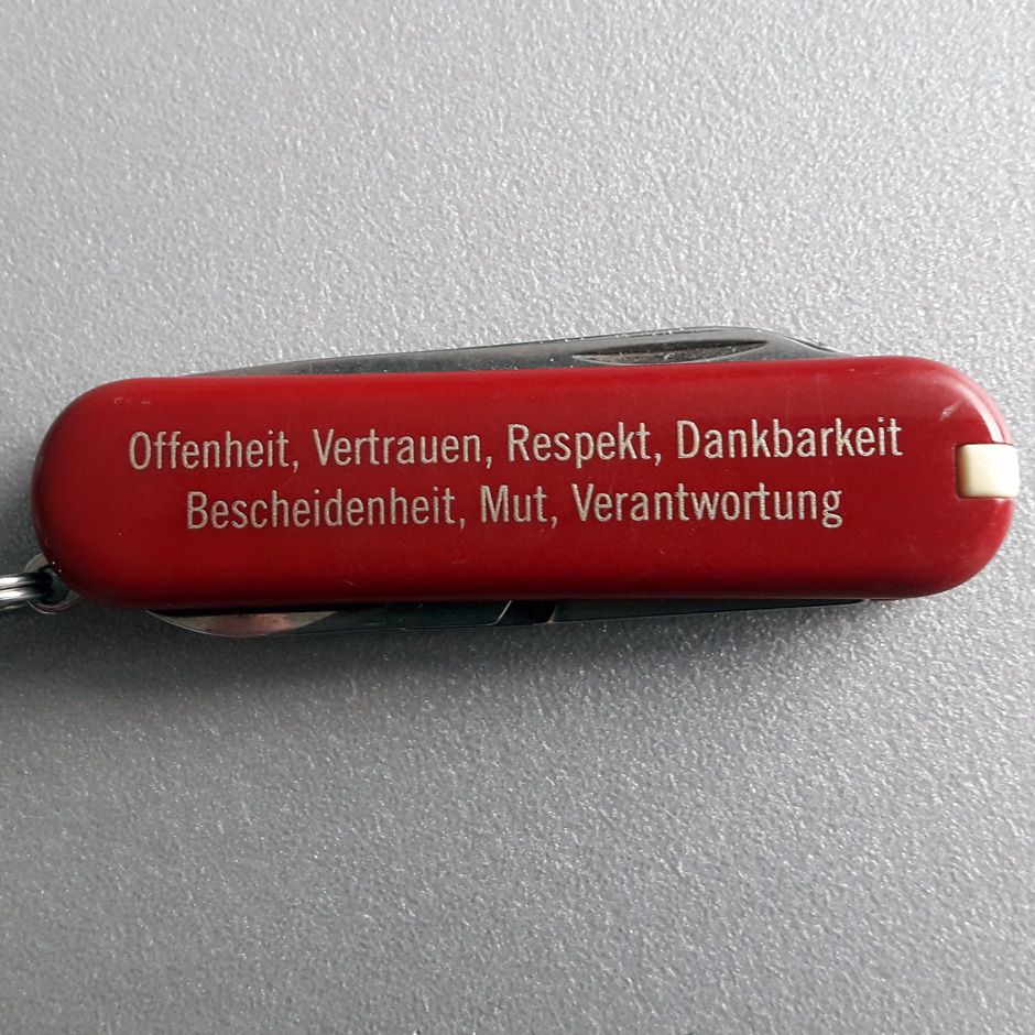 … dass jeder der über 1000 Mitarbeiter ein Victorinox Classic an seinem Schlüsselbund trägt? Bedruckt ist jedes mit den Werten, für die Victorinox steht: